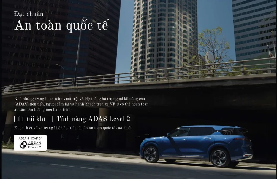 Hệ thống an toàn của VinFast VF 9 được tăng cường 11 túi khí đi cùng hệ thống hỗ trợ lái xe ADAS thông minh gồm chuỗi tính năng hiện đại như: hỗ trợ di chuyển khi đường đang ùn tắc, tự động chuyển làn an toàn, cảnh báo điểm mù, cảnh báo luồng giao thông đến khi mở cửa…